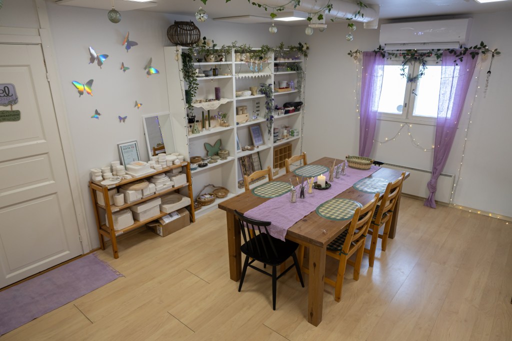 Omaan työtilaamme mahtuu tällä hetkellä yhteensä kuusi kurssilaista, mutta voimme mahdollisuuksien mukaan järjestää isommille ryhmille kursseja sovitusti studiollamme tai muissa tiloissa.🦋