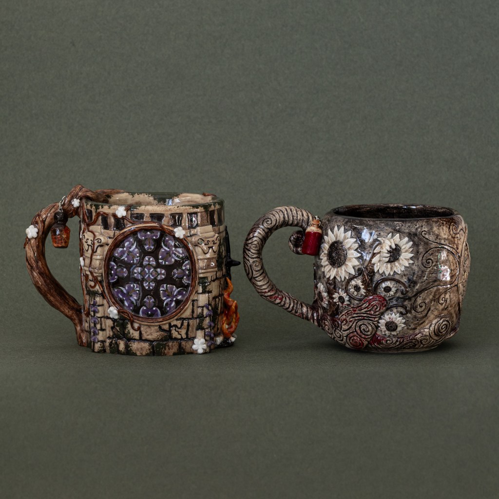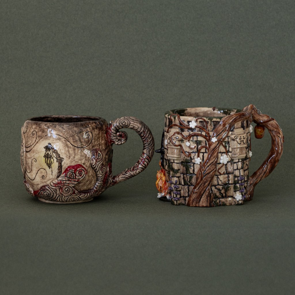 Käsinrakennetut taidemukit alkaen 50 € / kpl, settinä (muki ja aluslautanen) alkaen 75 €.